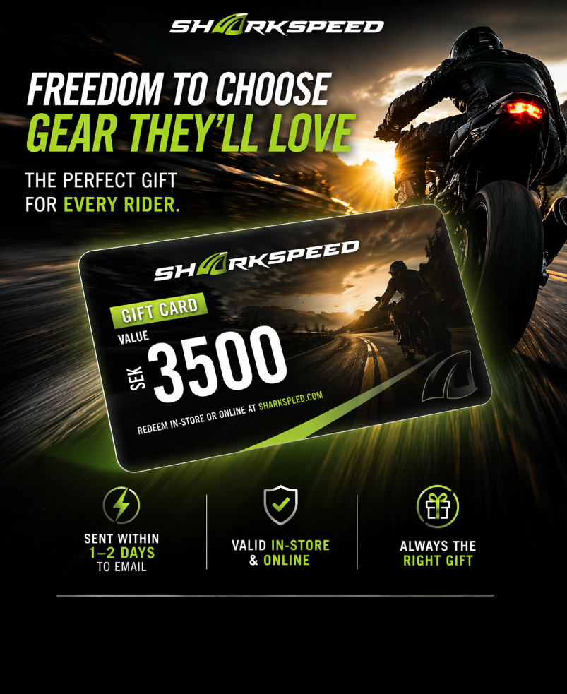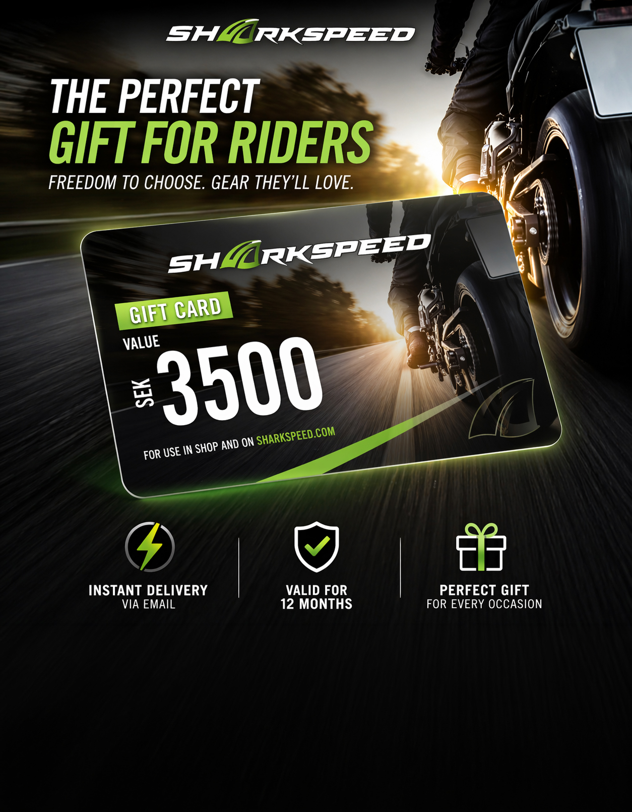 Leter du etter en gave som alltid blir riktig? Med et gavekort fra Sharkspeed gir du friheten til å velge selv blant vårt sortiment av MC-utstyr, klær og tilbehør.