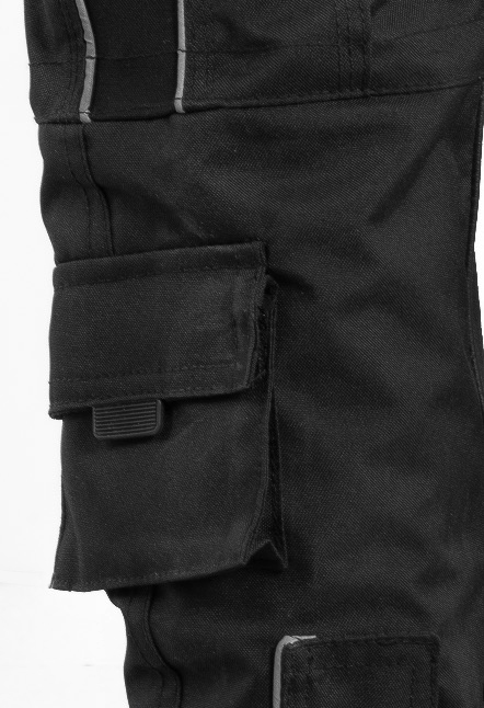 Avtakbare/avtakbare knebeskyttere og hoftebeskyttere. Luftventilasjon med glidelås på lårene.
