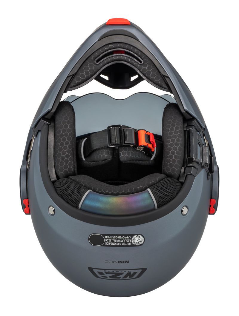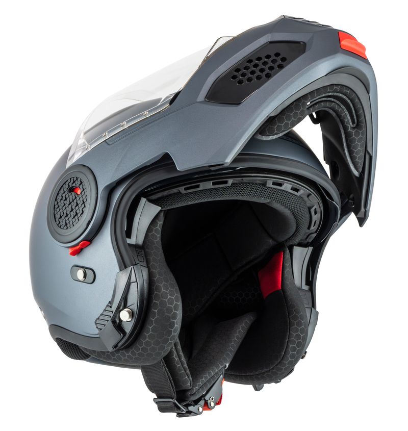 Med et enkelt trykk på en knapp felles hakepartiet opp, noe som gir bedre ventilasjon og smidighet ved stopp eller rolig bykjøring.