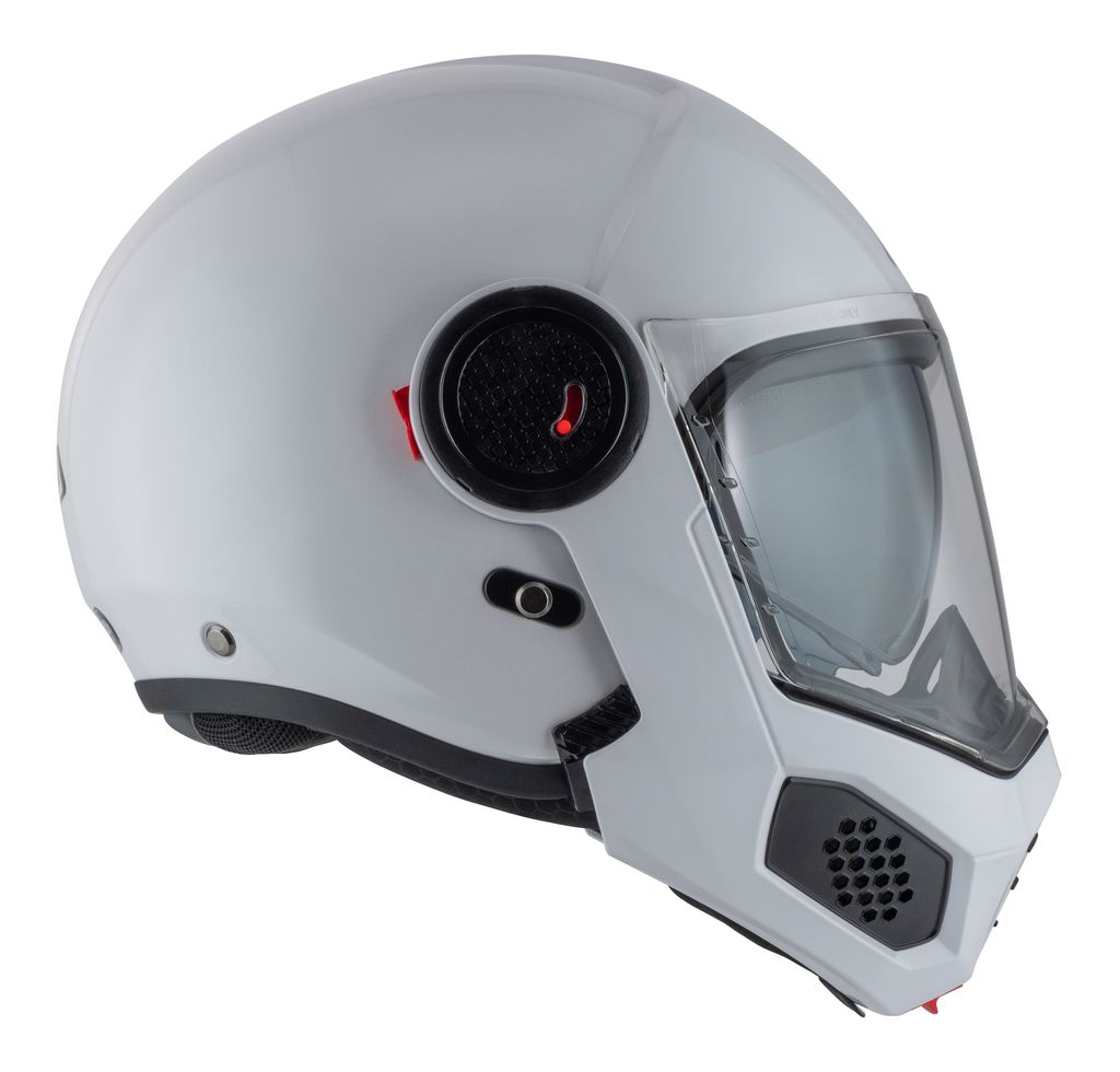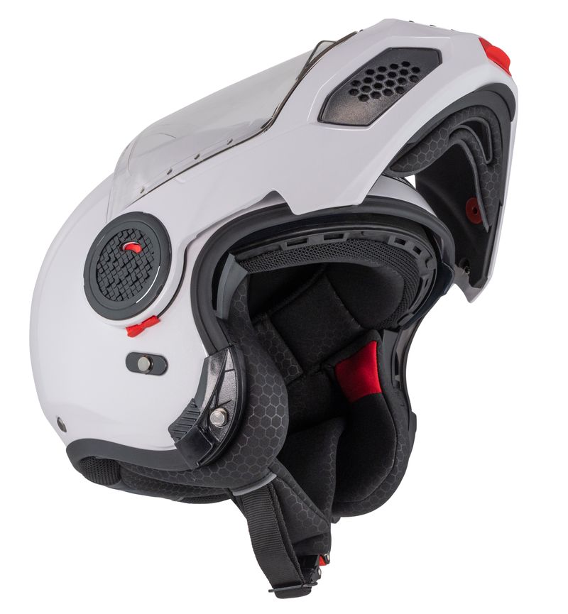 Med et enkelt trykk på en knapp felles hakepartiet opp, noe som gir bedre ventilasjon og smidighet ved stopp eller rolig bykjøring.