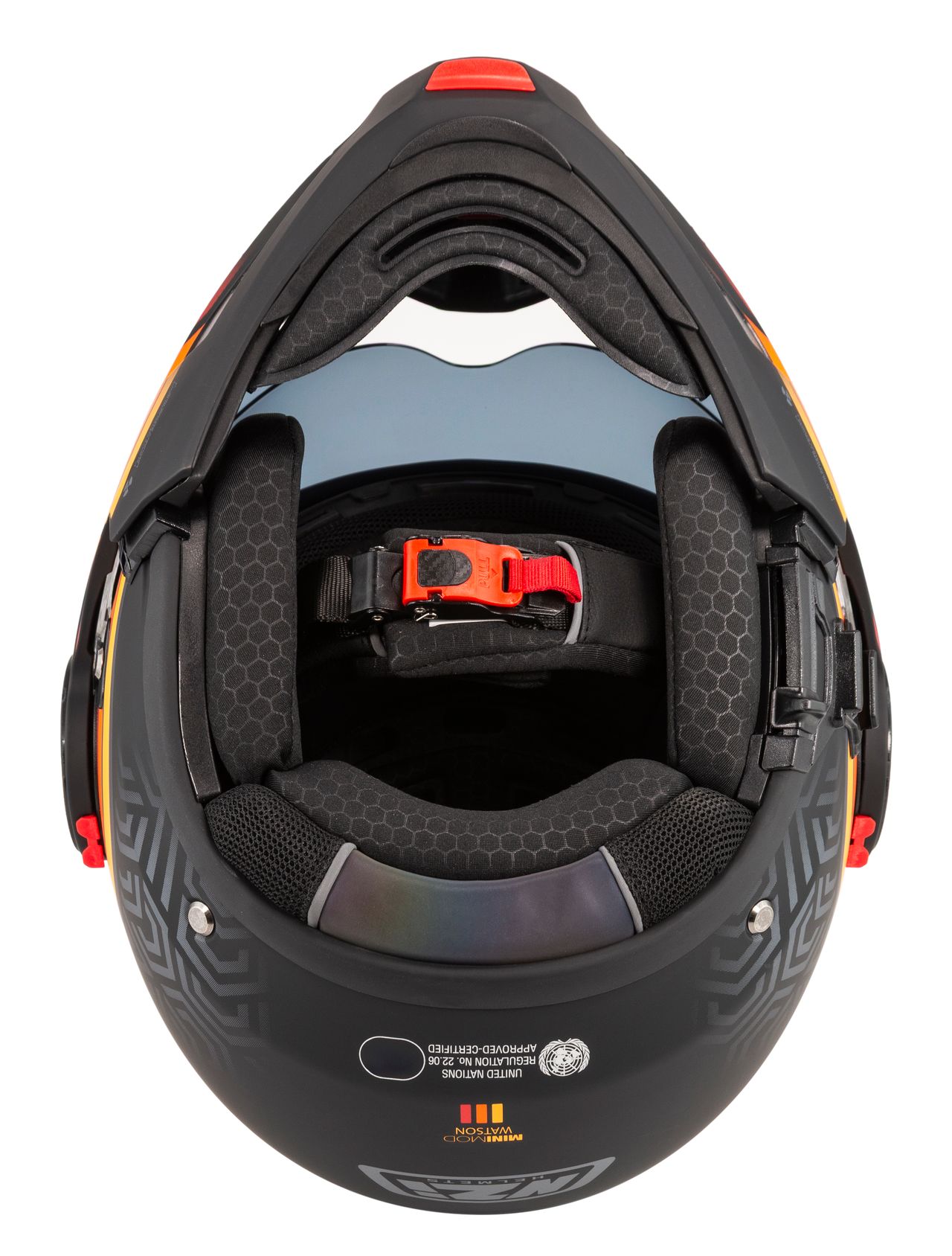 Ved sterkt sollys finnes det også et integrert nedfellbart solvisir, slik at du raskt kan tilpasse sikten uten å måtte bytte visir eller bruke solbriller.