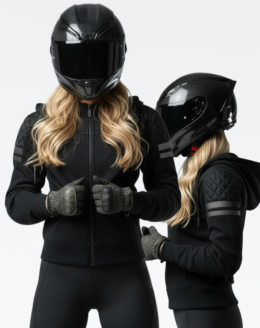 Albuer, skuldre og ryggparti er forsterket med Kevlar®, et av verdens sterkeste materialer. Dette gir ekstra beskyttelse mot slitasje, noe som gjør hoodien spesielt egnet for motorsykkelbruk.